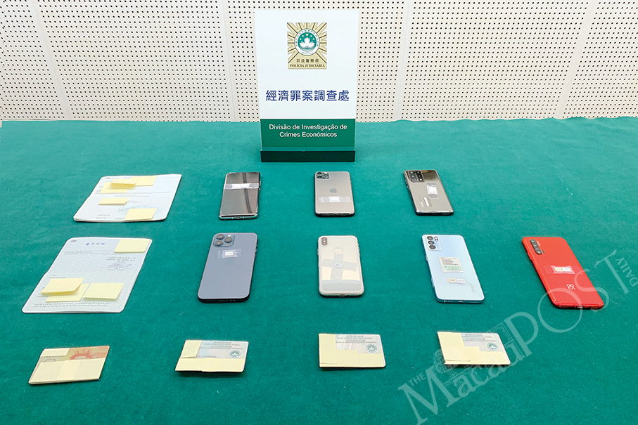 Evidence seized from the health voucher fraud suspects such as seven smartphones, three Macau ID cards and two passbooks is displayed at the Judiciary Police (PJ) headquarters yesterday.