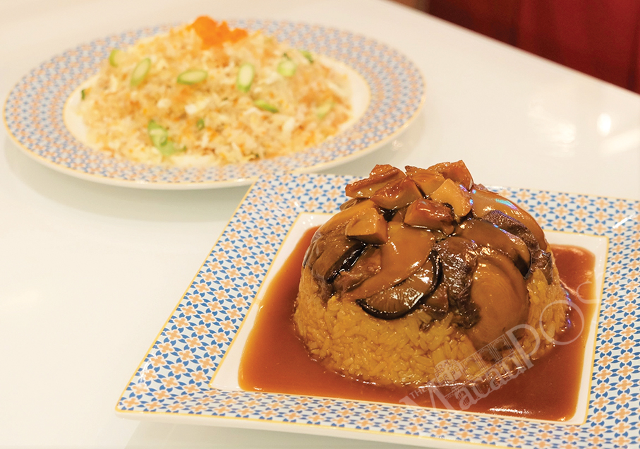This undated handout photo provided by Lisboeta Macau shows the signature dishes “Fried Rice with Sliced Abalone and Pigeon” (front) and the “Stanley Fried Rice with Egg White, Dry Scallop and Shredded Crab Meat” (back).
