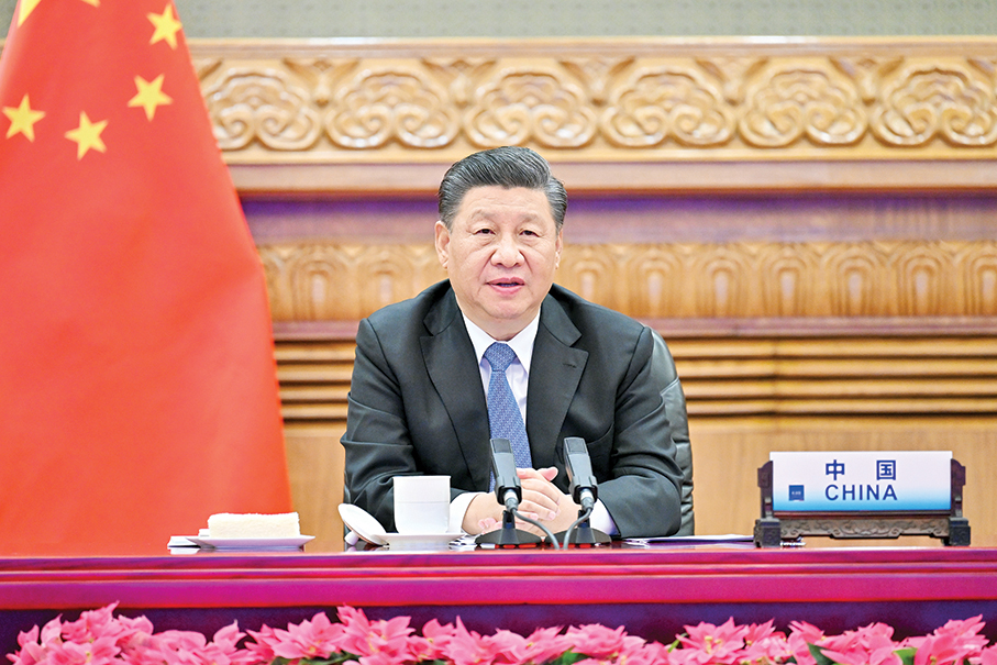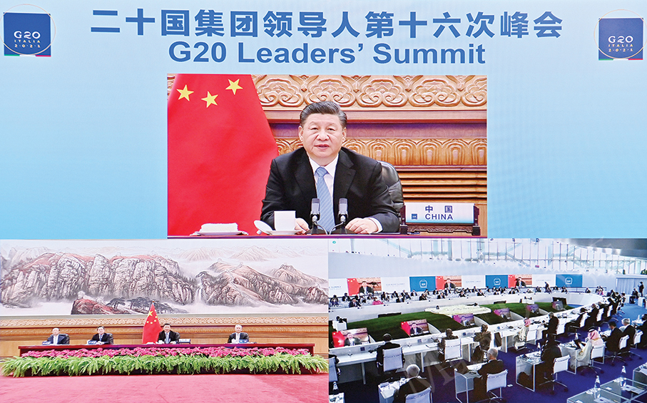 President Xi Jinping addresses the 16th G20 Leaders’ Summit in Rome via video link from Beijing yesterday. – Xinhua