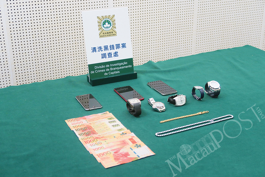 Evidence seized from the suspects such as five luxury brand watches and three smartphones is displayed at the Judiciary Police (PJ) headquarters on Friday.
