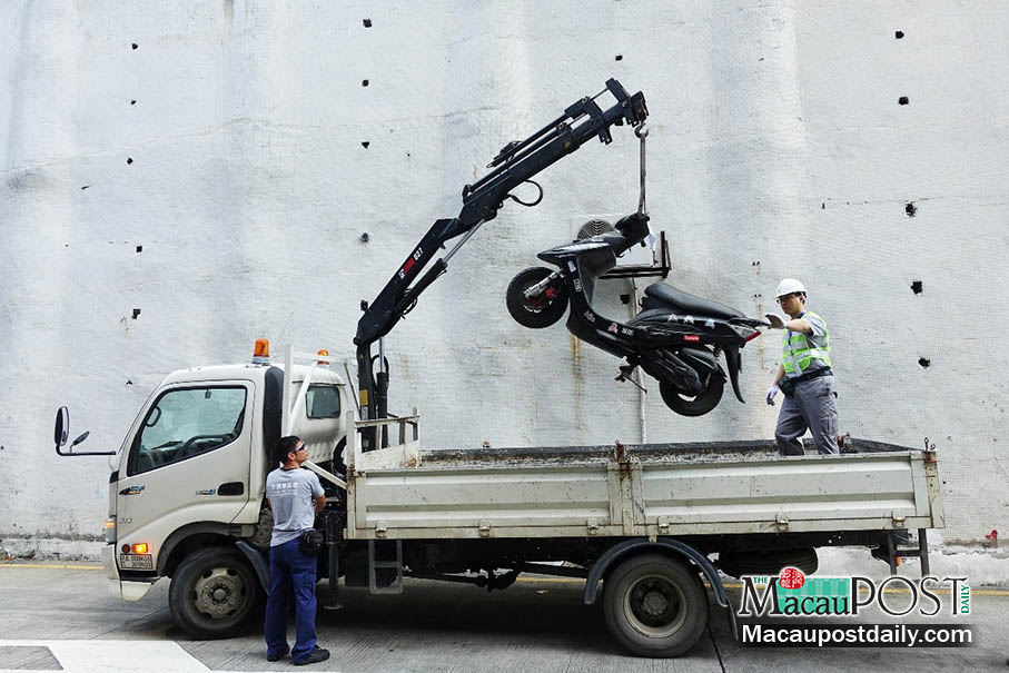 This handout photo released by the Transport Bureau (DSAT) yesterday shows a worker removing a scooter from a public car park.
