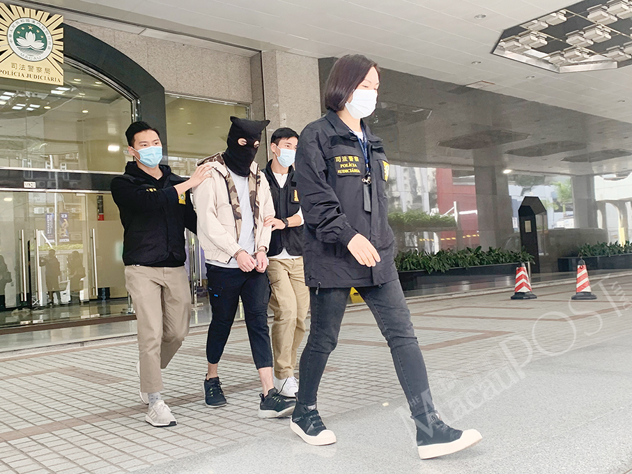 The hooded fraud suspect is escorted by Judiciary Police (PJ) officers from the PJ headquarters to a PJ vehicle yesterday. Photos: Camy Tam