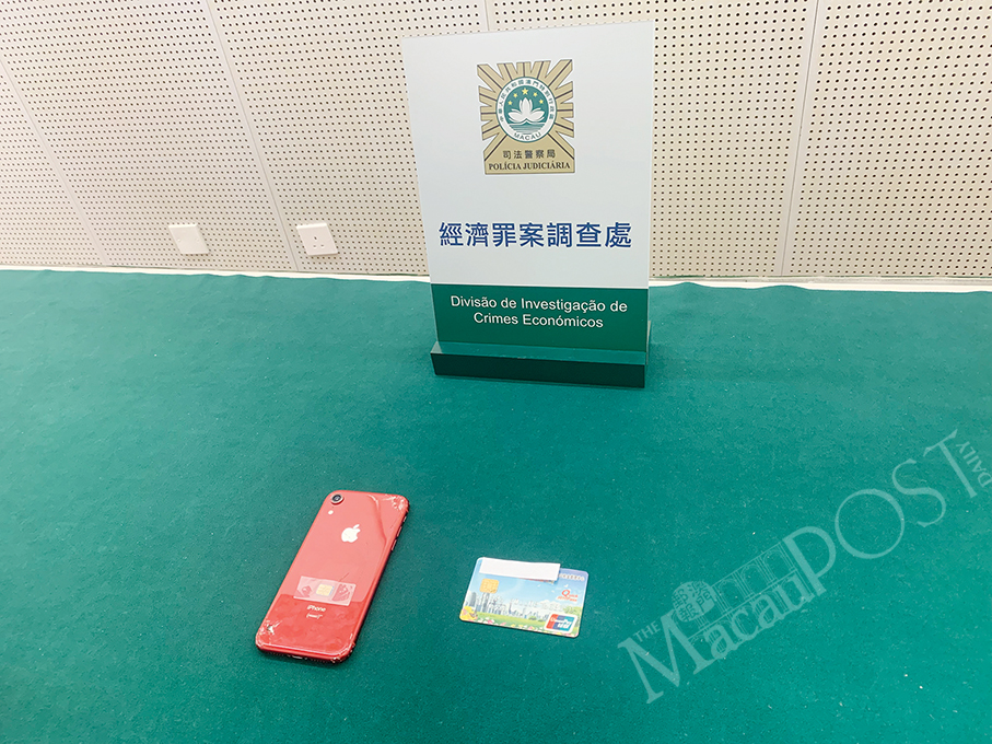 Evidence seized by Judiciary Police (PJ) such as a smartphone and a bank card is displayed at the PJ headquarters yesterday.
