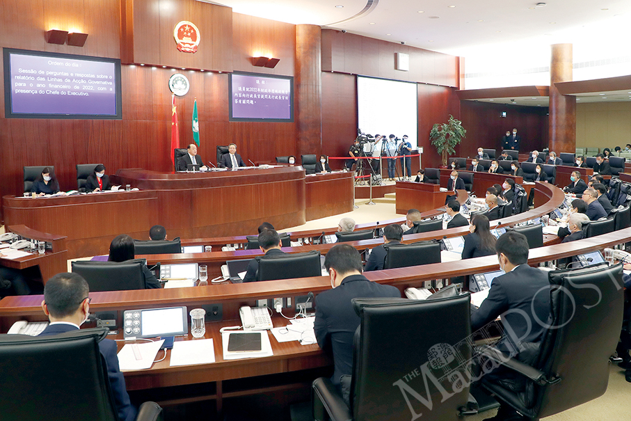 Legislators attend yesterday’s Q&A session about Chief Executive Ho Iat Seng’s 2022 Policy Address in the legislature’s hemicycle. Photo: GCS