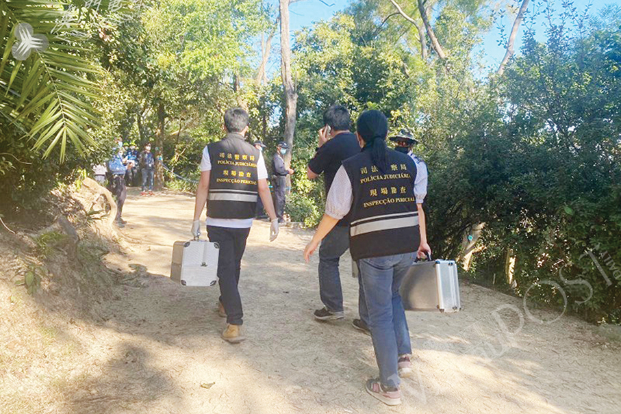 Judiciary Police (PJ) officers carry out an investigation yesterday at the Morro de Hac Sa Family Trail in Coloane’s Long Chao Kok where a human skeleton had been found. Photo courtesy of TDM