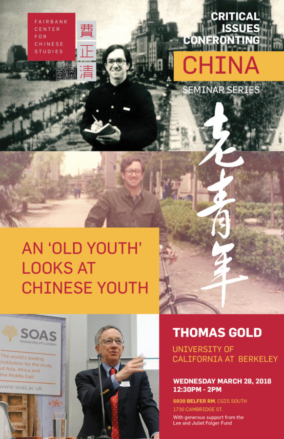 This Fairbank Center for Chinese Studies poster announces a seminar in 2018 by Prof. Thomas Gold about Chinese youth issues. – Photo courtesy of Harvard University