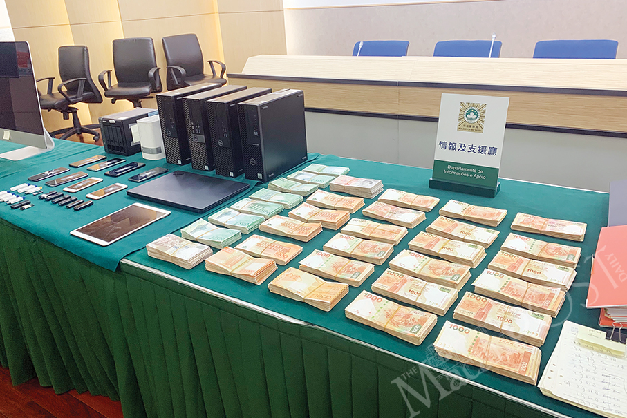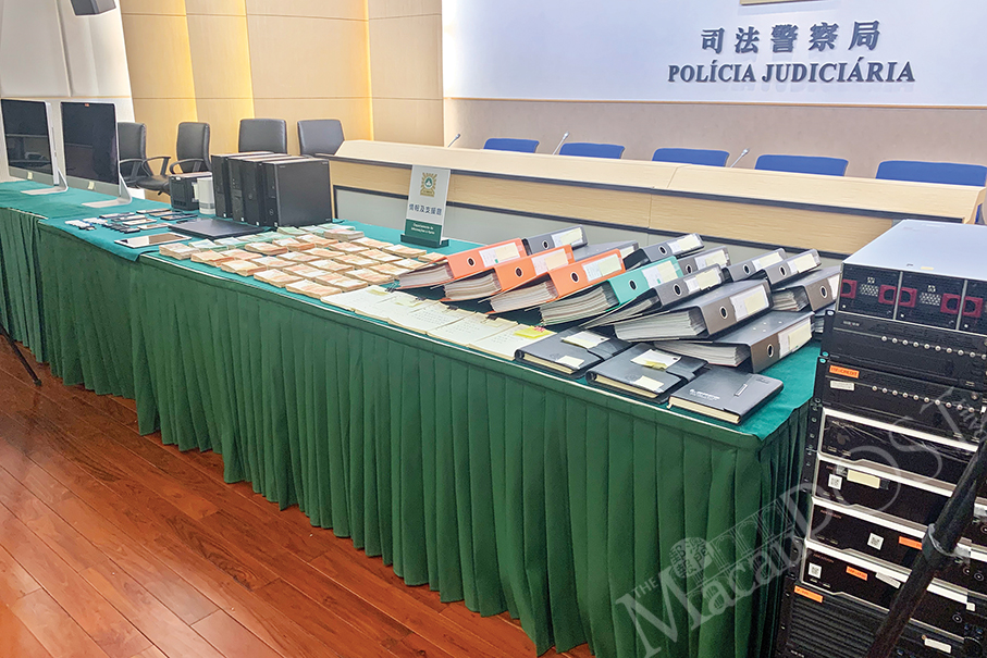 Evidence seized in the operation such as various currencies equivalent to 3 million patacas in cash, 8 smartphones, a number of USBs, computers, documents as well as accounting books is displayed at the Judiciary Police (PJ) headquarters yesterday.
