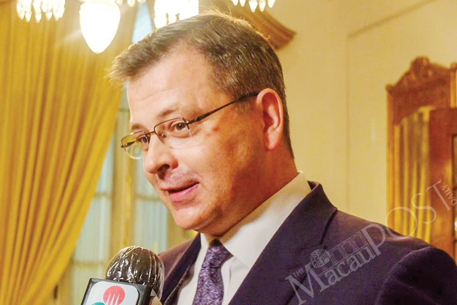 Macau European Chamber of Commerce Board of Directors President Henry Brockman speaks with reporters after yesterday evening’s cocktail reception to celebrate the 8th anniversary of MECC at Clube Militar.