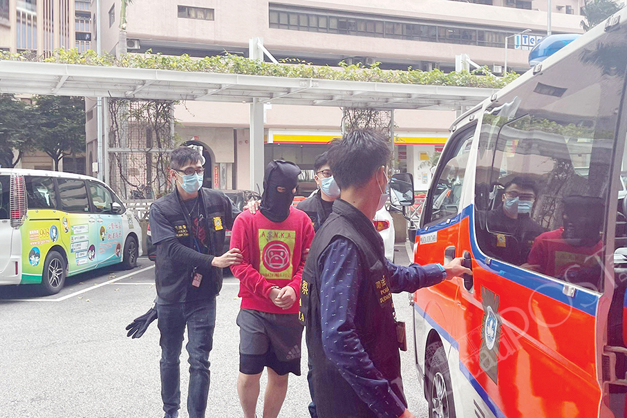 The hooded Vietnamese drug suspect is escorted by Judiciary Police (PJ) officers from the PJ headquarters to a PJ vehicle yesterday. Photo courtesy of TDM