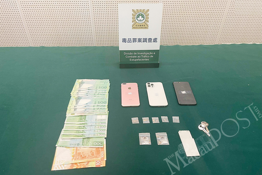 A male Vietnamese non-resident worker was arrested on Monday for selling drugs in the Rua do Campo neighbourhood recently. Two packets of ice weighing a total of 1.1 grammes with an estimated market price of 3,300 patacas and 10,000 patacas in cash suspected to be drug money were seized from the suspect, Judiciary Police (PJ) spokesman Ho Chan Nam said at a special press conference yesterday.