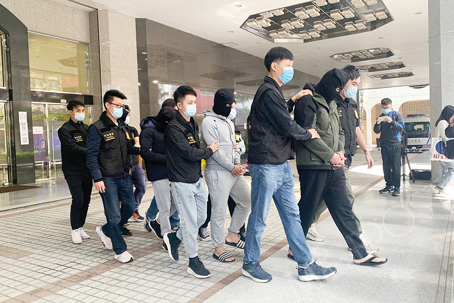 The four hooded fraud suspects are escorted by Judiciary Police (PJ) officers from the PJ headquarters to a PJ vehicle in Zape yesterday. Photo: Camy Tam