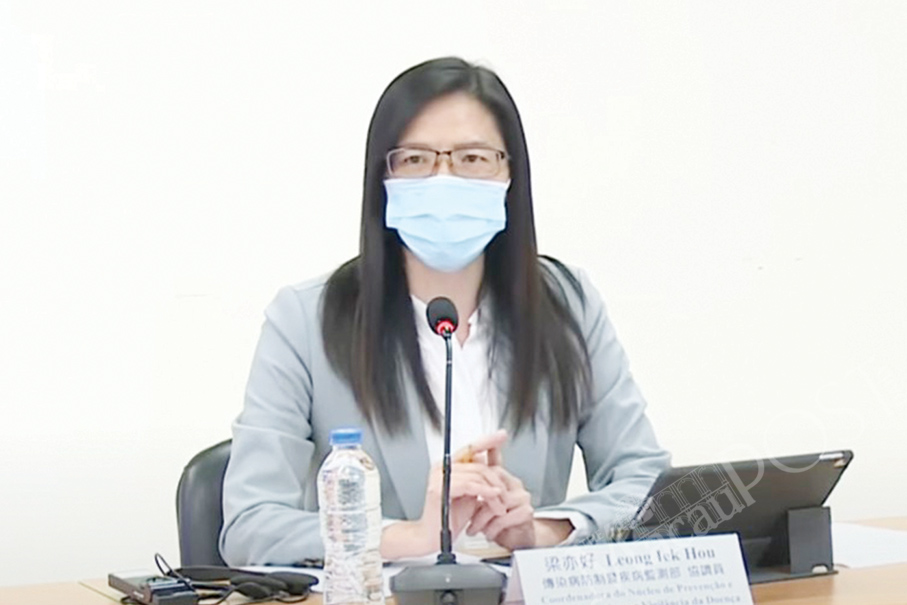 Health Bureau (SSM) Control of Communicable Diseases and Surveillance of Diseases Department Coordinator Leong Iek Hou addresses yesterday’s press conference about the city’s COVID-19 situation. Photo: GCS