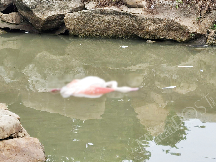 This photo shows one of the dead flamingos floating in a pond of Seac Pai Van Park on Wednesday.