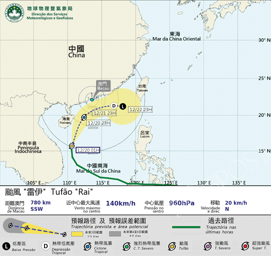 The bureau said earlier last night that Rai was expected to gradually turn northward. The Signal No. 1 was hoisted when Rai had entered Macau’s 800 km standby warning zone.
