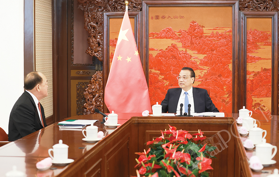 BEIJING – Premier Li Keqiang yesterday met with Chief Executive Ho Iat Seng at the central authorities’ Zhongnanhai compound in Beijing yesterday, acknowledging Ho’s work.