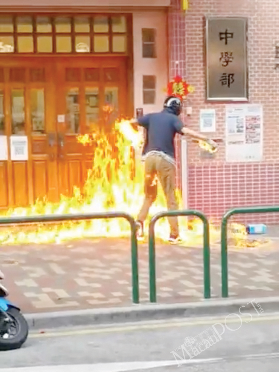 According to police and local Chinese-language media reports as well as video footage by passers-by, at about 4 p.m. on Friday the 21-year-old suspect wearing a crash helmet and holding a container suddenly splashed apparently flammable liquid on the front gate of the school, after which he ignited it.
