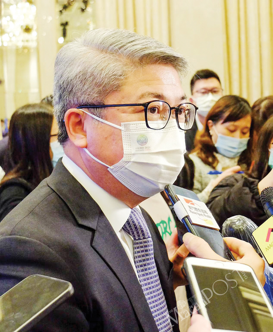 Sports Bureau (ID) President Pun Weng Kun speaks with reporters after yesterday’s press conference at the Ritz Carlton in Galaxy in Cotai.