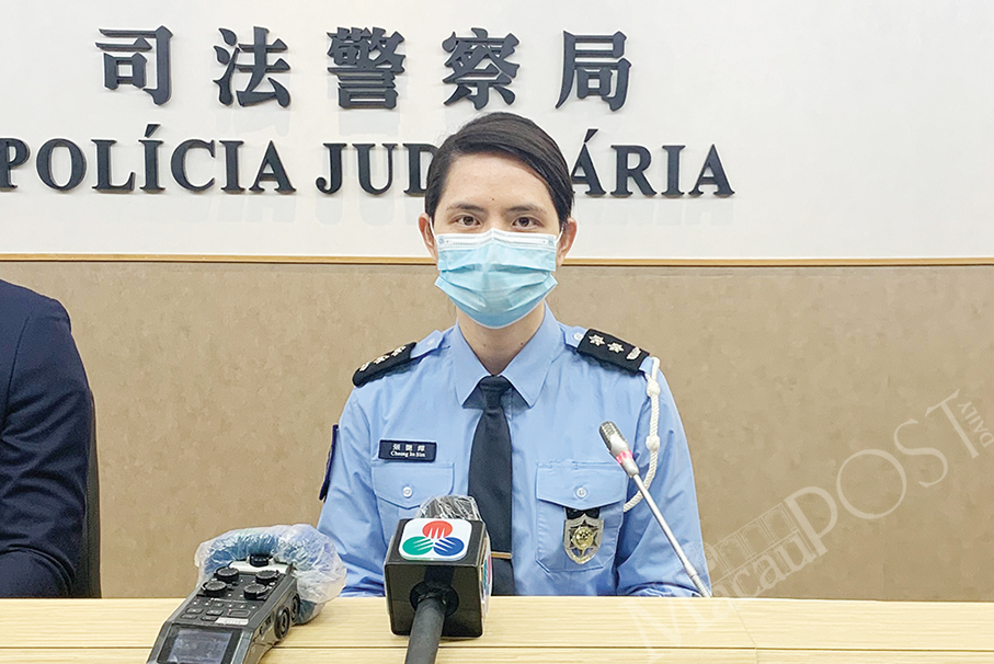 Public Security Police (PSP) spokeswoman Erica Cheong Im Sim looks on during yesterday’s press conference at the Judiciary Police (PJ) headquarters. Photo: Camy Tam
