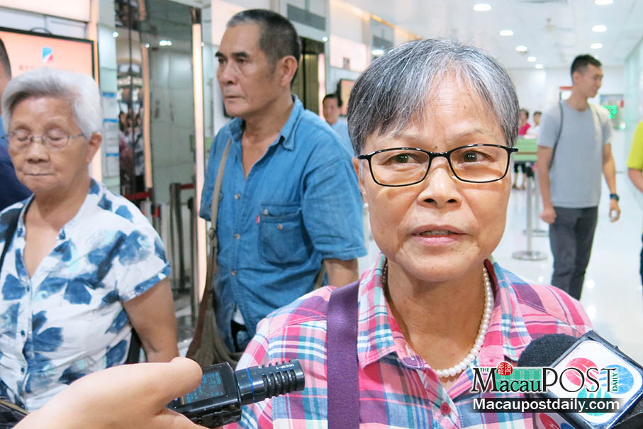 Lei Iok Ian, president of the Macau Family Reunion Federation, speaks to reporters with two elderly members of her federation in the background after her sentencing at Macau Square yesterday afternoon. – Photo: Ian Sio Tou