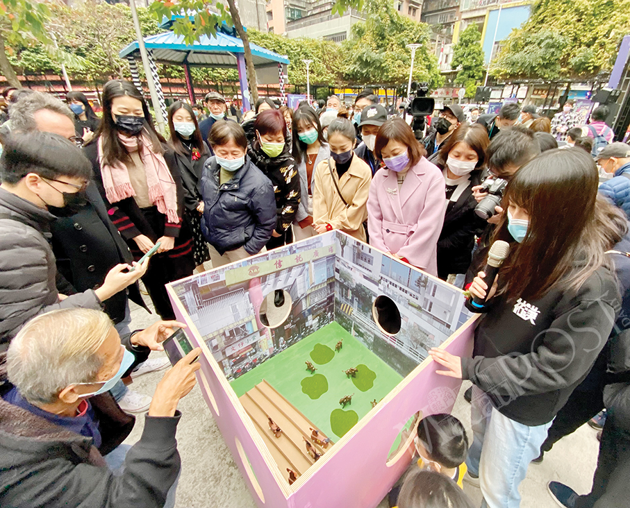 Local residents and reporters gather around one of the exhibits near the sitting-out area in Rua Oito do Bairro Iao Hon yesterday after the opening ceremony for the 21st Macao City Fringe Festival’. Photos: Ula Cheang
