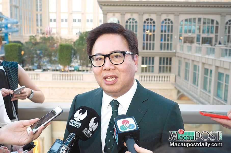 Sands China President Wilfred Wong Ying Wai speaks to reporters at The Parisian in Cotai yesterday. Photo: Iong Tat Choi
