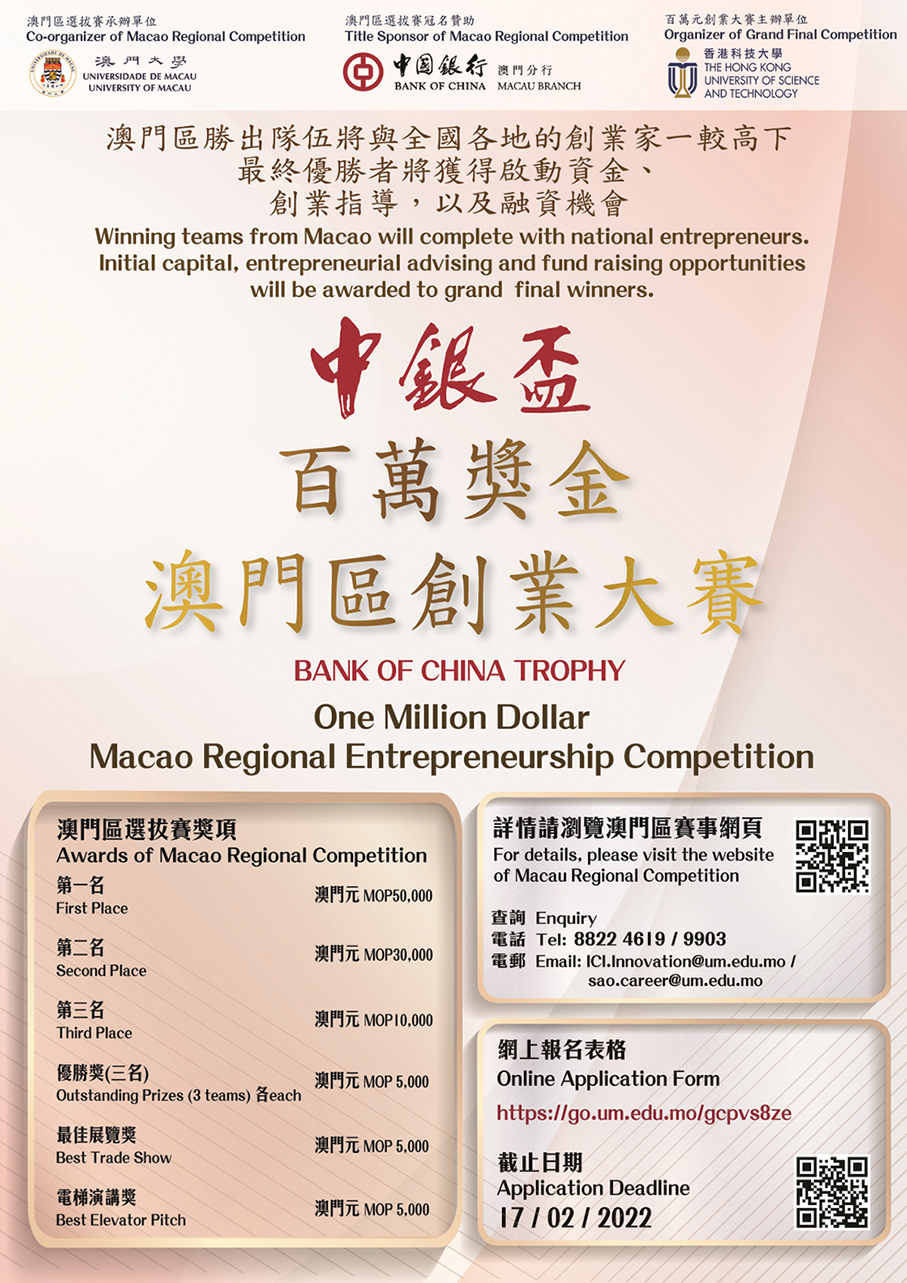 Application for the University of Macau (UM) hosted “2022 Bank of China Trophy One Million Dollar* Macao Regional Entrepreneurship Competition” is open until February 17, according to a statement from the public university.