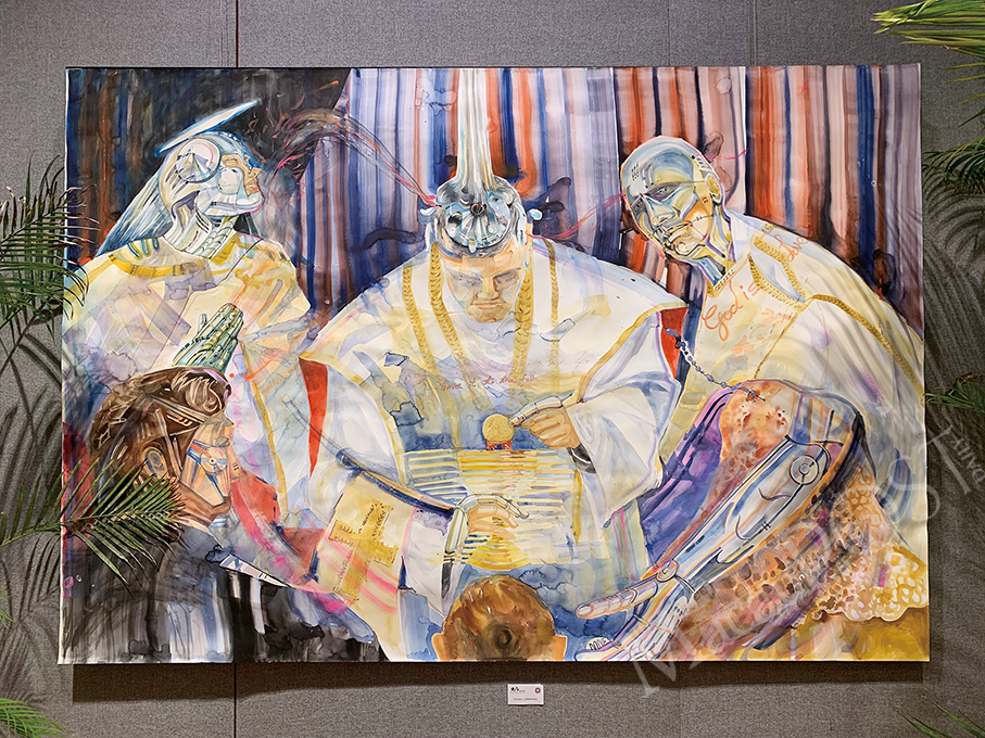 The displayed artworks consist of different art mediums such as watercolour, ink, and photography.