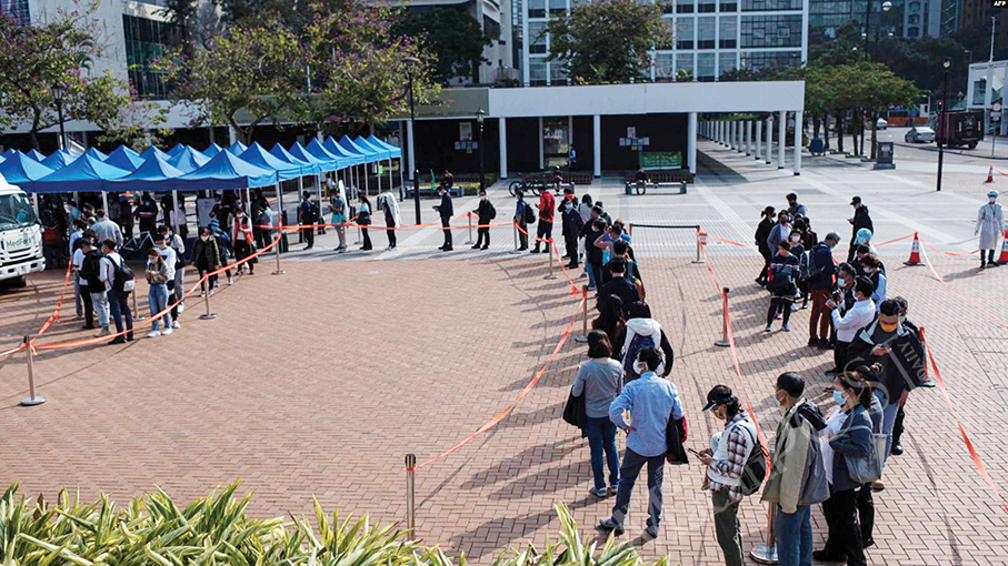 People queue to be tested for COVID-19 at a street-side testing booth in Hong Kong on Saturday. Photo: AFP