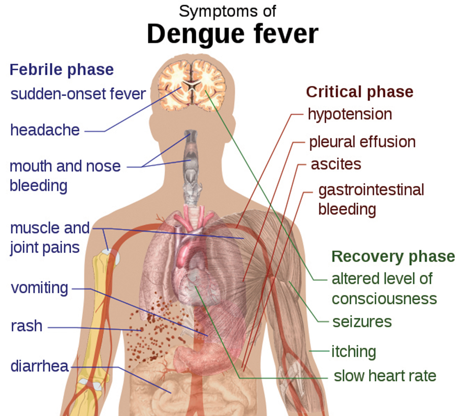 Schematic depiction of dengue fever symptoms – Image courtesy of Mikael Häggström/Wikimedia Commons