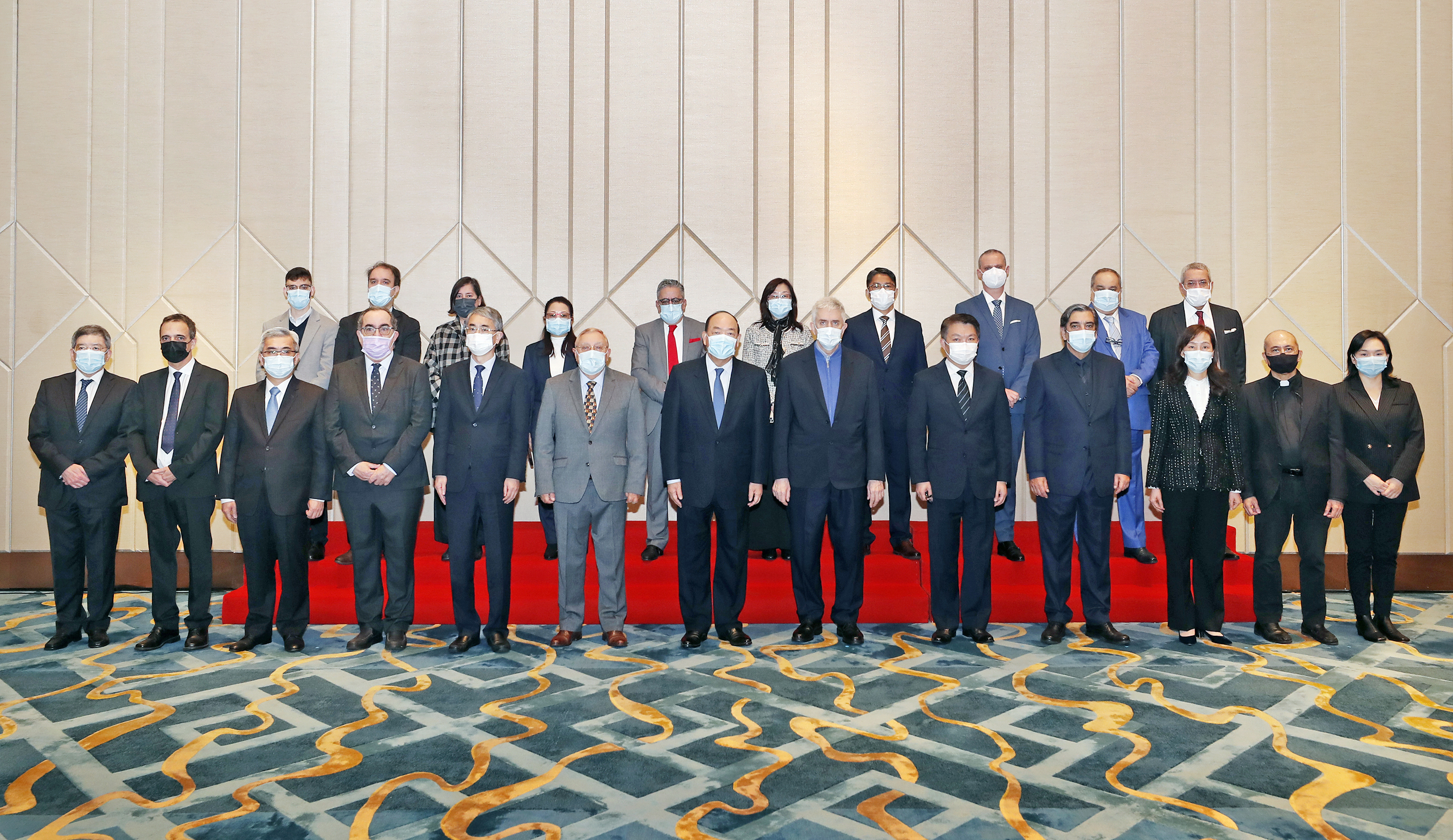 Chief Executive Ho Iat Seng (centre, front) poses yesterday before a New Year lunch hosted by the local government at Galaxy Macau’s JW Marriott Hotel in Cotai for senior representatives from Macau’s English- und Portuguese-language media. In a speech, Ho urged the journalists to “play a more active role in [enhancing] communication between foreign-language speakers in Macau and the government of the Macau Special Administrative Region.” The chief executive also underlined the important role of the English- and Portuguese-language media in the further development of Macau’s role as a platform between China and Portuguese-speaking countries and its role in the nation’s Belt and Road Initiative (BRI). Ho said that the media outlets’ efforts “have been crucial in enhancing understanding about Macau and China across the world.” He also thanked the local English- and Portuguese-language media for their role in informing the public “in a timely manner” about the government’s ongoing COVID-19 prevention and control measures. – Photo: GCS Caption: Staff Reporter