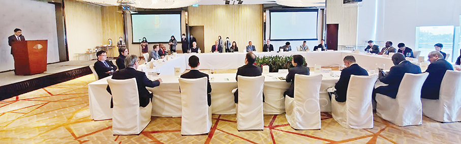Ji Xianzhen (left), secretary-general of the Permanent Secretariat of the Forum for Economic and Trade Cooperation between China and Portuguese-speaking Countries (Macau), delivers a speech during a Spring Festival lunch hosted by the nine-nation organisation for Macau’s English- and Portuguese-language media at Mandarin Oriental Macau Hotel in Nape yesterday. The lunch was also attended by diplomats from Portuguese-speaking countries. Ji praised Macau’s foreign-language media for their “essential role” in informing the world about Macau and Macau’s important role as a platform between China and Portuguese-speaking countries. Ji, a career diplomat who speaks Spanish and Portuguese with previous postings to Caracas, Madrid and Lisbon, took up his current post last month. Photo: Forum Macau Caption: Staff Reporter