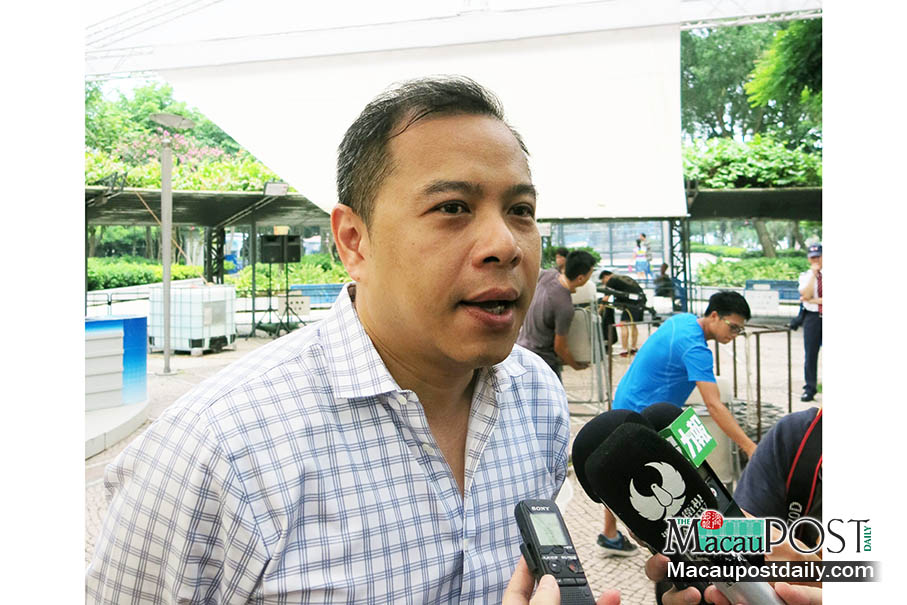 Urban Renewal Council member Wong Chung Yuen talks to reporters after attending yesterday’s Macau Forum in Areia Preta Park. Photo: Ian Sio Tou