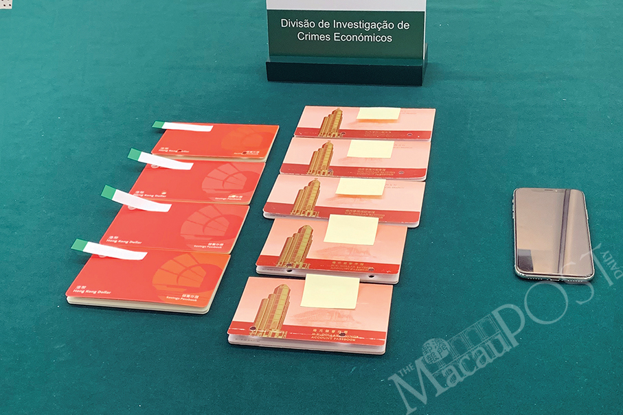 Evidence seized from the fraud suspect such as nine bank passbooks and a smartphone is displayed at the Judiciary Police (PJ) headquarters yesterday.