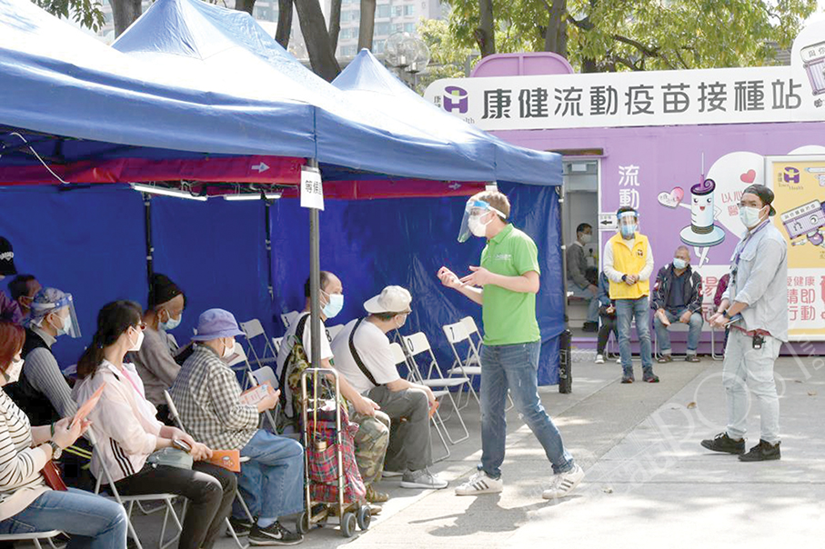 Residents wait for receiving a Sinovac inactivated jab outside a mobile COVID-19 vaccination facility at Tai Hing Estate in Tuen Mun in Hong Kong on Friday. Photo: Xinhua