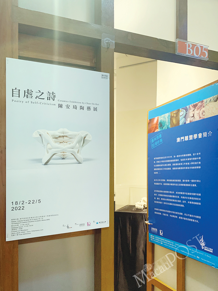 An exhibition entitled “Poetry of Self-Criticism: Ceramics Solo Exhibition by Chan On Kei” (自虐之詩—陳安琦陶藝展) is on display at 10 Fantasia in S. Lázaro district, according to a statement by the gallery.