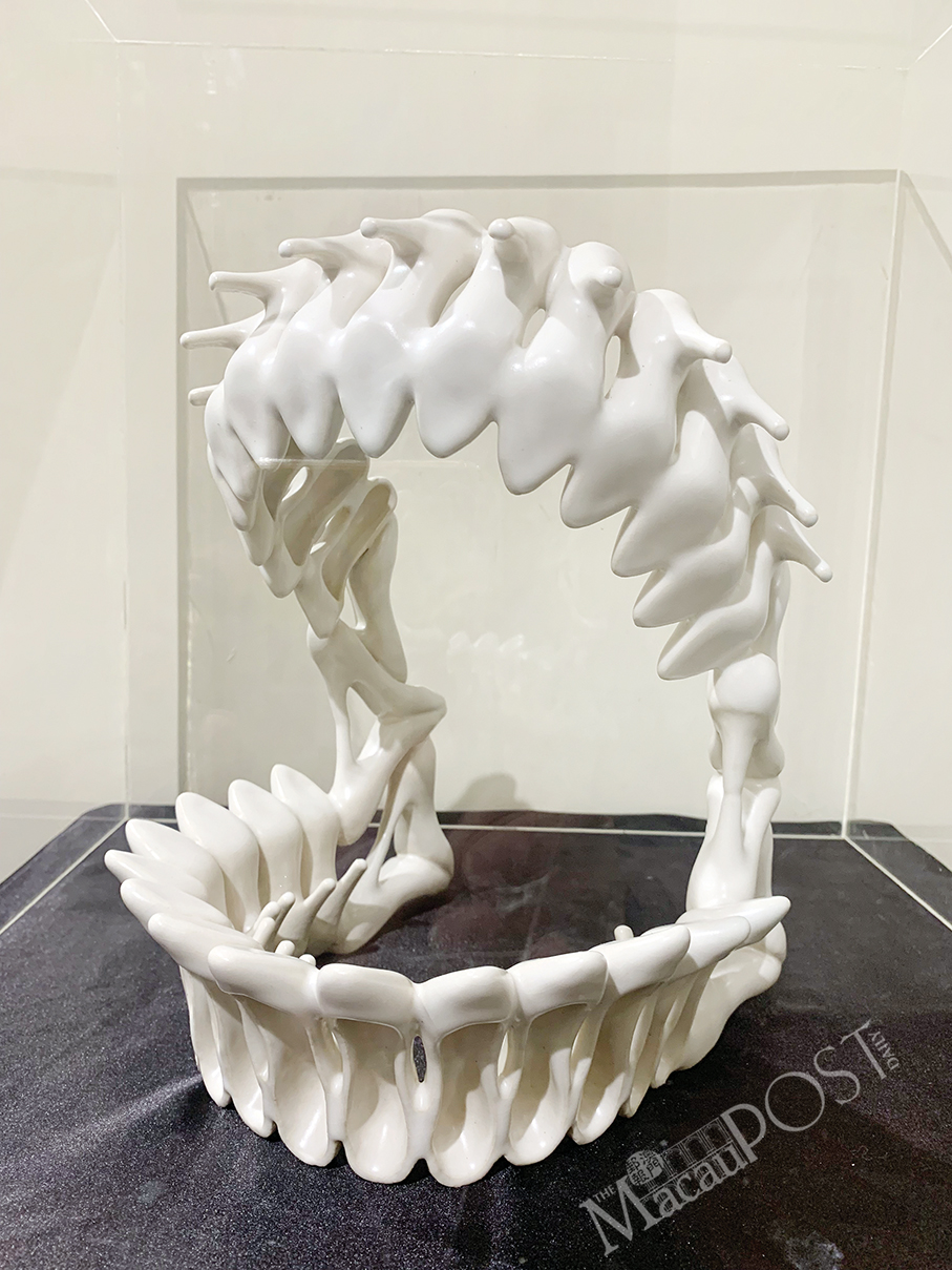 According to the statement, the exhibition showcases Chan’s six ceramic works. It is divided into two series, “Bite” (噬) and “Skeleton” (骨骼). The “Bite” series expresses the idea that in addition to being beautiful, the wearer must also endure the physical pain associated with the beauty, just like being attacked by high heels, which violates the function of shoes that are originally used to protect the feet, like a beauty-loving curse.