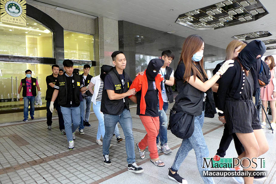 Judiciary Police (PJ) officers escort the four drug suspects from the PJ headquarters in Zape to a PJ vehicle yesterday. Photo: Iong Tat Choi