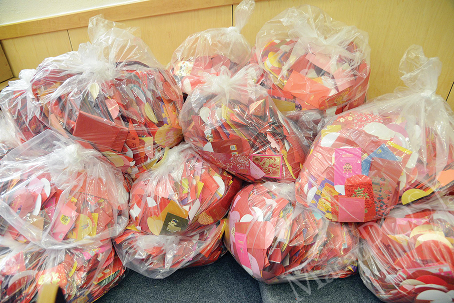The statement said that the bureau will collaborate with social welfare groups and distribute the reusable red envelopes to the public. The statement pointed out that some of the collected red envelopes will be used at workshops, and the remainder will be recycled. The statement noted that in the past five years, the bureau has collected 9.08 million red envelopes in total, 2.83 million of which were reusable, or 31 percent of the total.