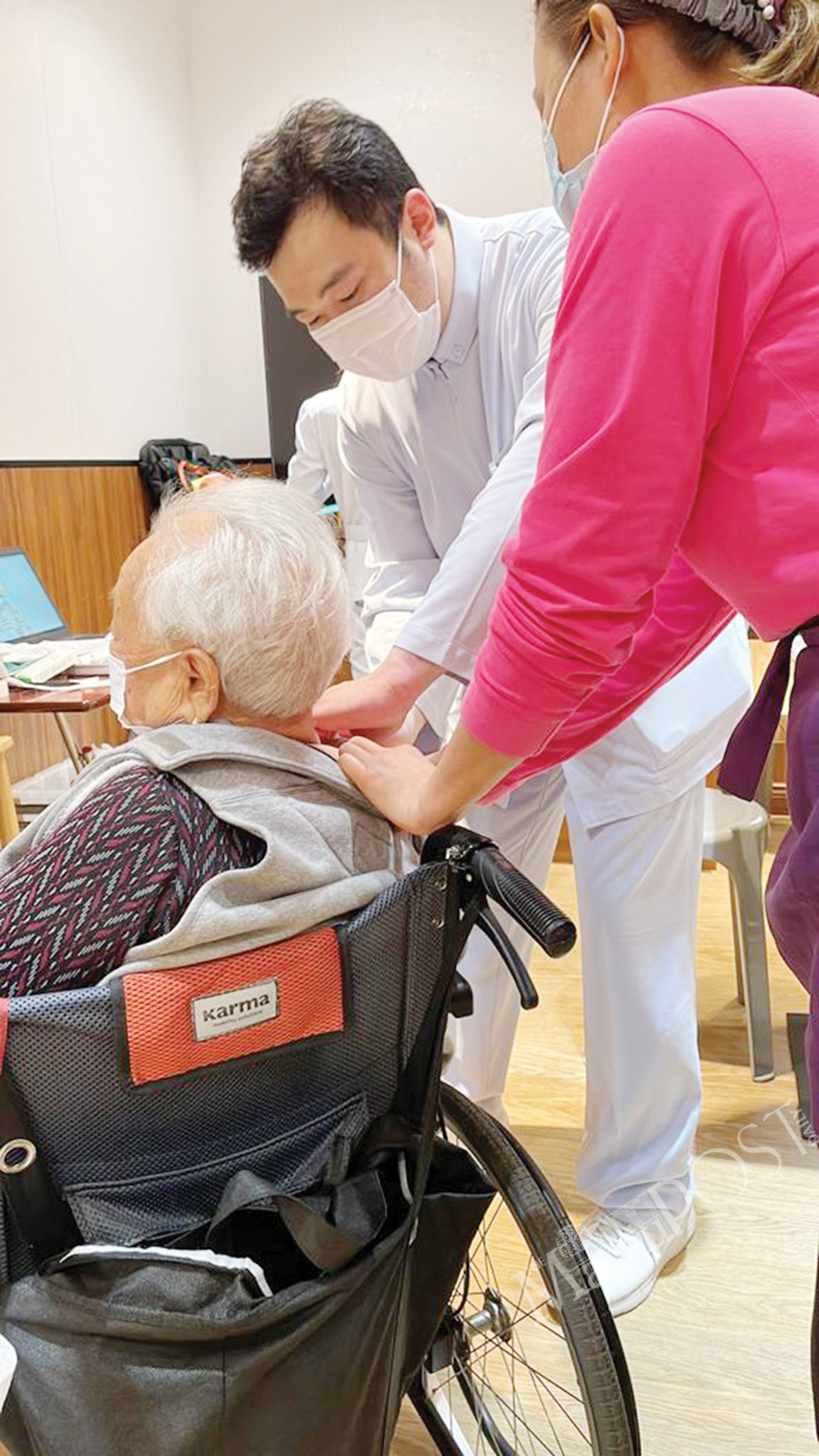 A health worker administers a COVID-19 jab to a senior citizen at a retirement home on Saturday. The government said on Saturday that 74.3 percent of those living in Macau’s 24 retirement homes and other social service residential facilities for senior citizens had received at least one COVID-19 jab, an increase from around 35 percent about three weeks ago. Photo: GCS