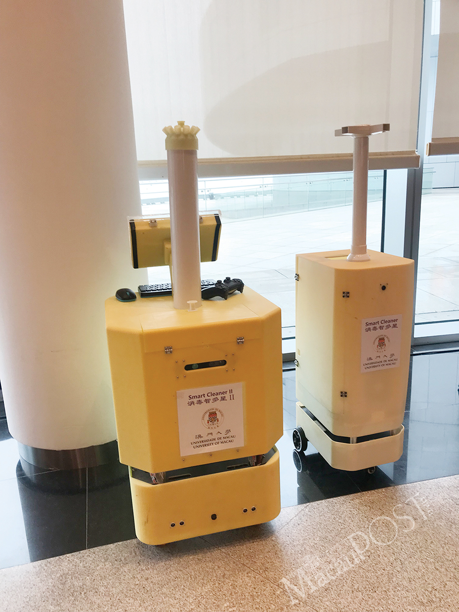Tow Smart Cleaner disinfection robots designed by the University of Macau (UM) are displayed at yesterday’s event.