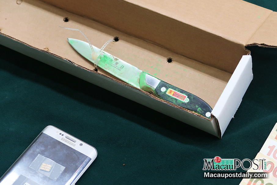 This photo taken on Saturday at a Judiciary Police (PJ) pressroom shows the knife the victim used to probably kill himself. Photo: MPDG