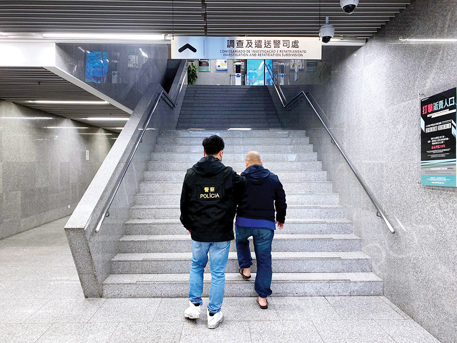This undated handout photo provided by the Public Security Police (PSP) yesterday shows a PSP officer escorting the document forgery suspect to a police station.
