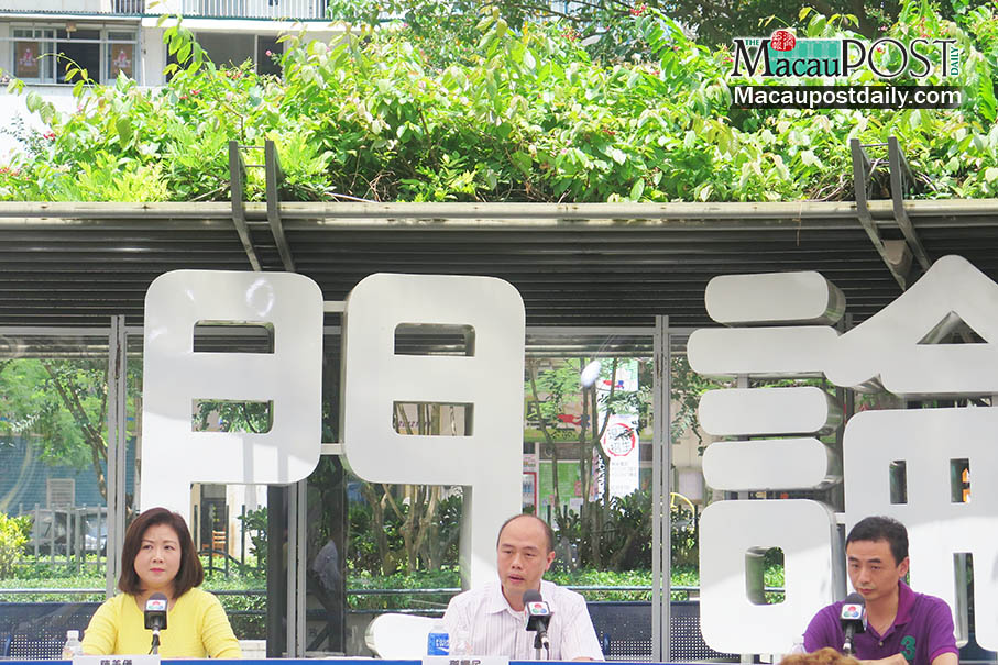 Andy Tang Iu Man (centre), who heads the Meteorological Division of the Meteorological and Geophysical Bureau (SMG), speaks during yesterday’s Macau Forum while lawmaker Melinda Chan Mei Yi (left) and local think-tank Collective Wisdom Policy Centre Vice President Andy Loi Man Keong look on in Areia Preta Park. Photo: Tony Wong
