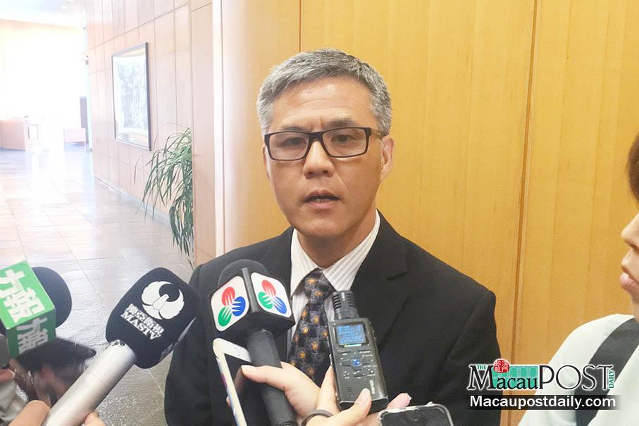 Ip Peng Kin, chief-of-cabinet of the Secretariat for Social Affairs and Culture, talks to reporters after attending a committee meeting at the Legislative Assembly (AL). Photo: Davis Ip
