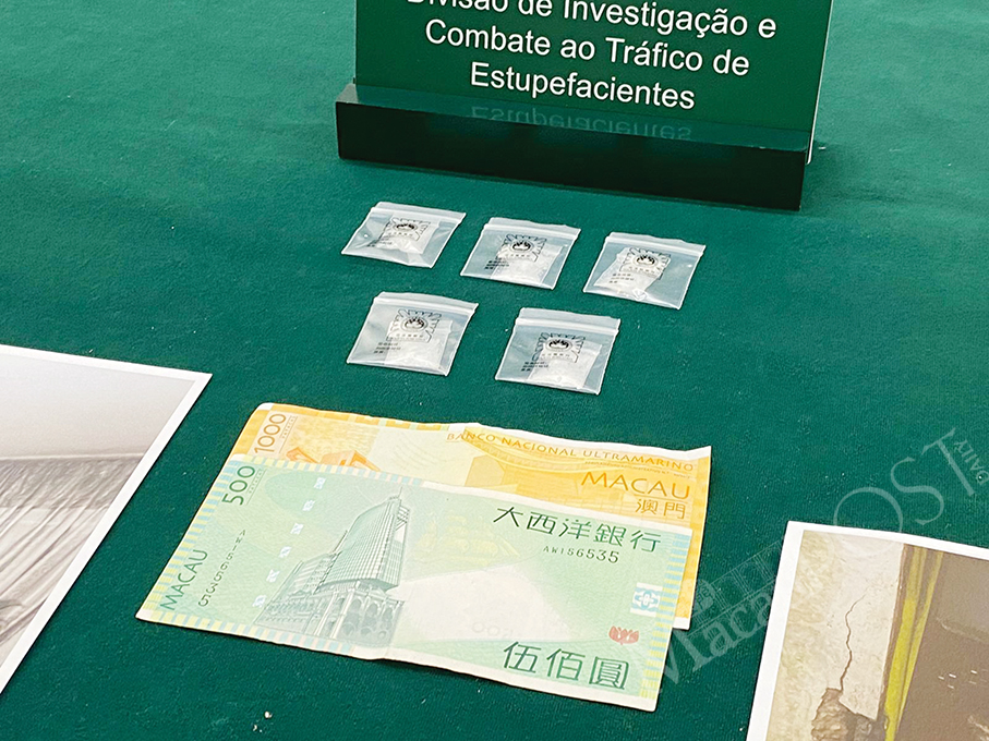 Ho noted that the police found five packets of crystal meth, aka ice, in the stairwell near his flat, as well as 1,500 patacas, which officers suspect to be drug money, in his home. Ho said that the suspect admitted that the ice belonged to him, but he refused to reveal the source of the drugs and whether they were for his own use or to be sold. Ho underlined that the suspect’s drug test came back negative.