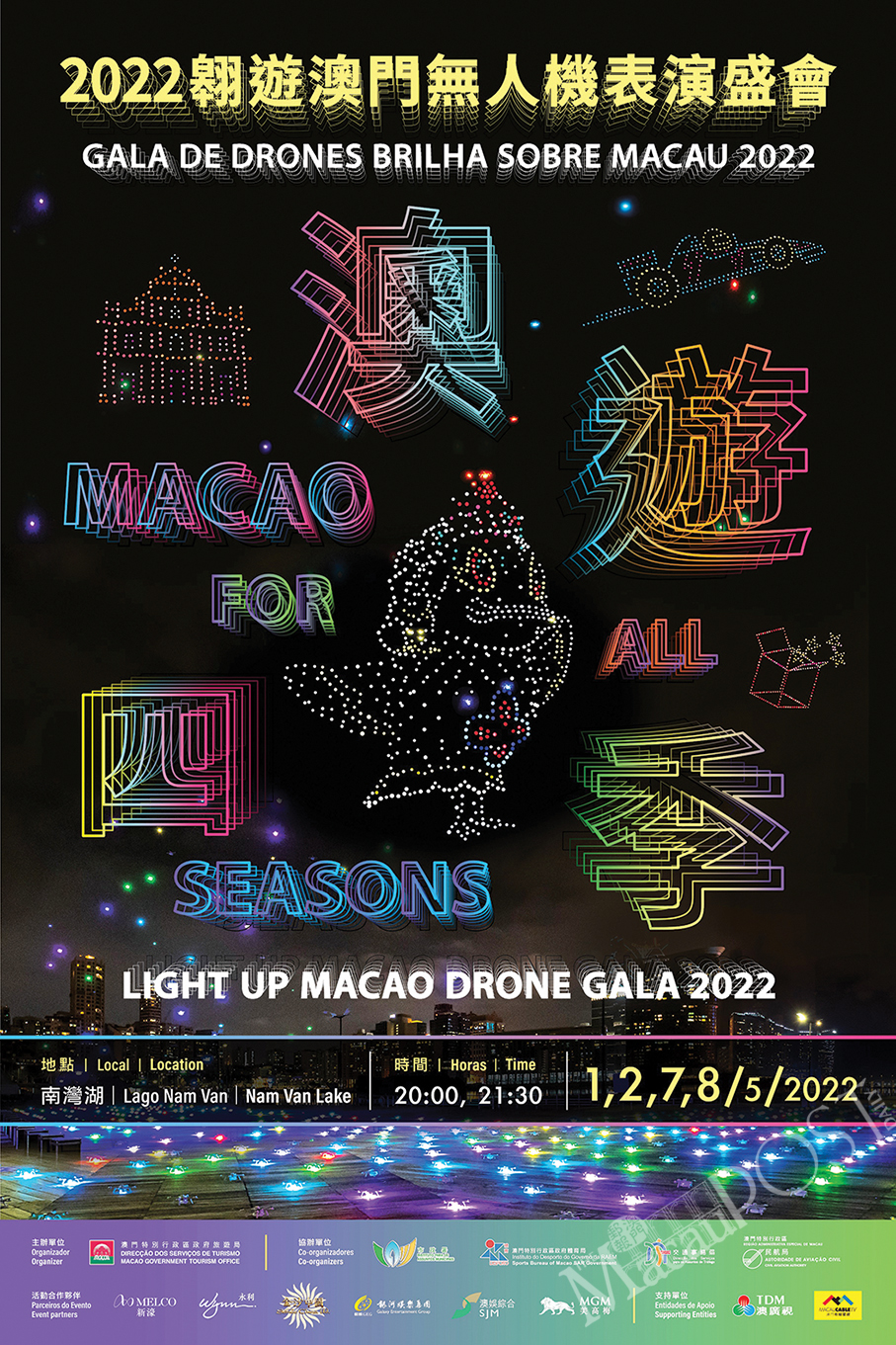 A total of eight drone shows for the Light up Macao Drone Gala 2022 are slated for the Labour Day holidays on May 1-2, as well as on May 7-8 at Nam Van Lake, according to a statement from the Macau Government Tourism Office (MGTO).