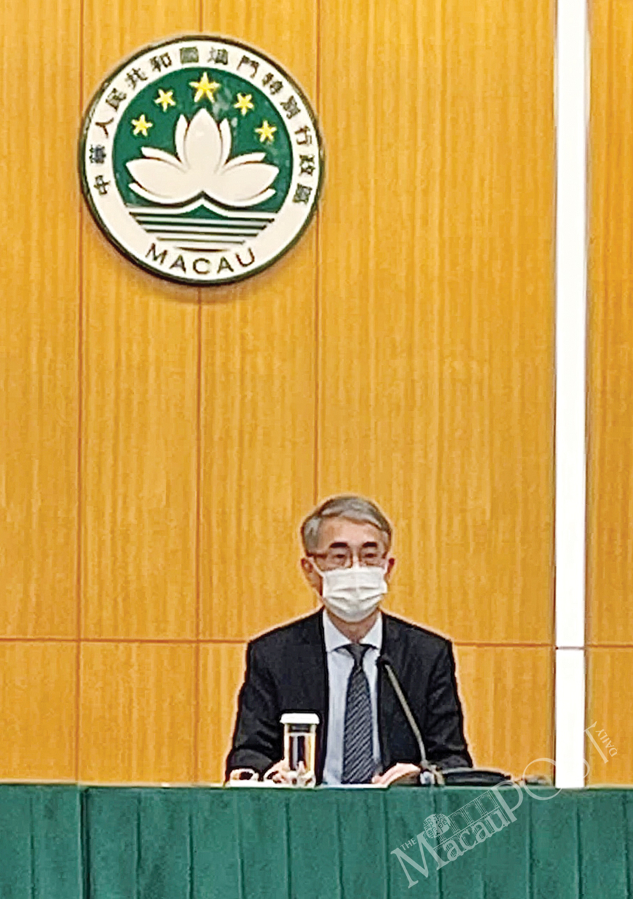 Secretary for Administration and Justice André Cheong Weng Chon addresses yesterday’s Executive Council press conference at Government Headquarters about the government’s new round of the e-consumption benefit scheme.