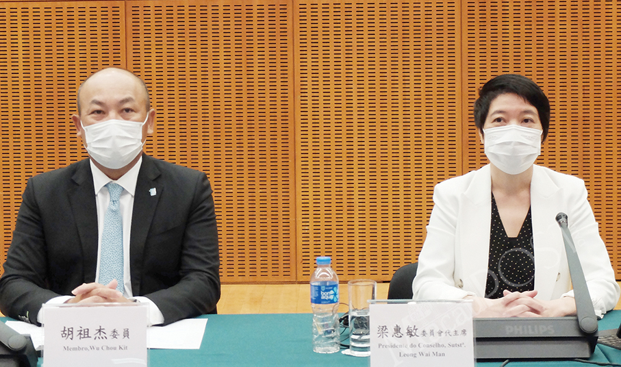 Cultural Affairs Bureau (IC) President and Cultural Heritage Committee Acting Chairperson Leong Wai Man (right) and committee member and spokesperson Wu Chou Kit speak with reporters after yesterday’s second plenary meeting of this year at the Macau Cultural Centre in Nape. Photo: Rui Pastorin