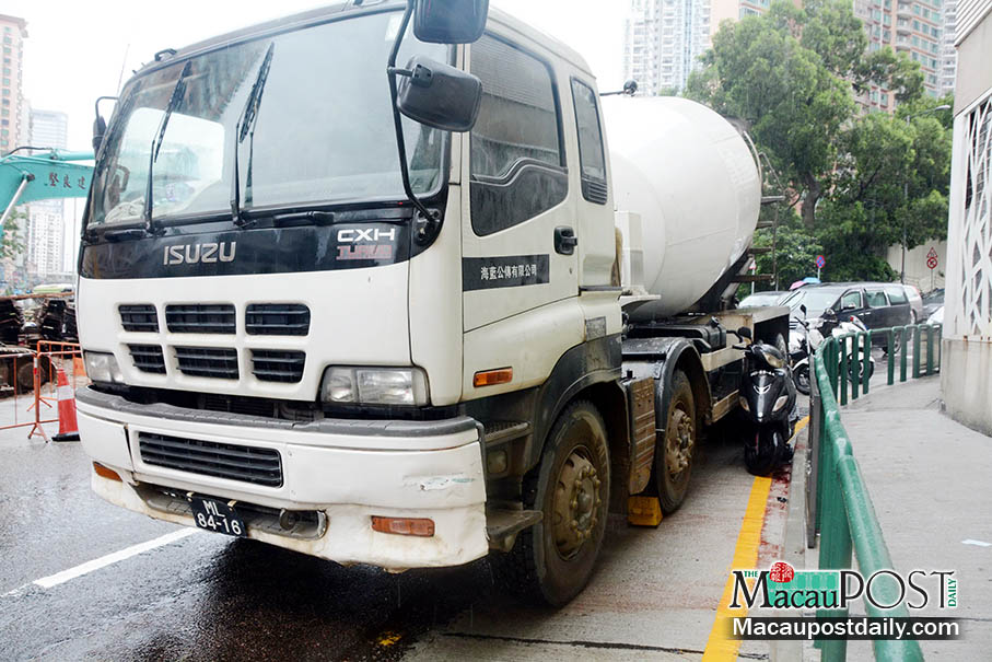 The scooter and concrete mixer lorry are seen in Rotunda Ouvidor Arriaga in Taipa shortly after yesterday’s collision. Photo: Iong Tat Choi