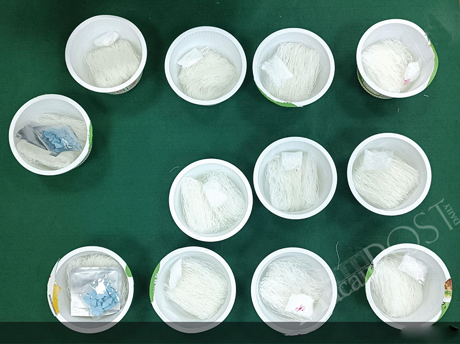 According to Lei, the cup noodles contained 49 grammes of ice, 48.3 grammes of ketamine and 57 blue pills suspected to be ecstasy. Lei said that the 31-year-old Vietnamese suspect, surnamed Nguyen, was arrested at her flat in the central district after she picked up a suspicious parcel from a pick-up spot. After questioning, Lei added, the suspect claimed that she was a masseuse and that she picked up the parcel for somebody else, but refused to disclose any further details. Lai noted that the market price of the drugs is 215,000 patacas.